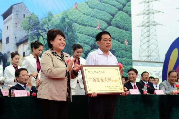 广西自治区副主席李康为获得广西“茶叶大师”的昭平茶叶专家何玉开颁奖 |